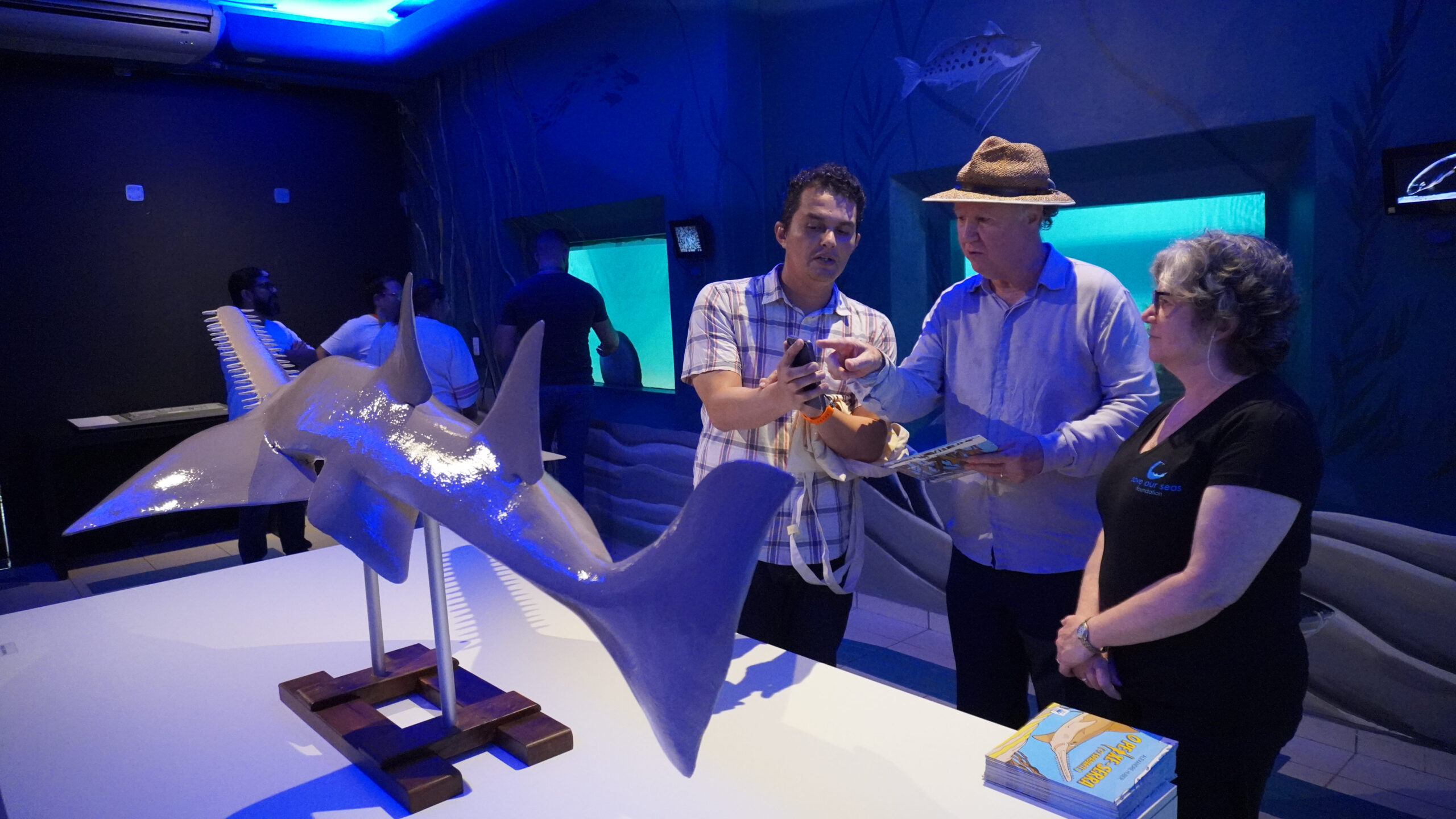 A exposição “Ahetxiê: um tesouro da costa amazônica” informa e sensibiliza o público sobre a necessidade de preservar o peixe-serra, conhecido regionalmente como “espadarte”, uma espécie criticamente ameaçada de extinção. O trabalho também destaca a relação cultural do povo Karipuna do Amapá com o peixe-serra, considerado uma entidade sagrada. No Aquário Jacques Huber, o mais antigo em funcionamento no Brasil, a mostra apresenta ilustrações do artista Alexandre Huber, réplicas produzidas com materiais recicláveis por Jackson Alves e Yermollay Caripune, além de conteúdos que revelam a importância ambiental, simbólica e científica da espécie para os povos amazônicos.